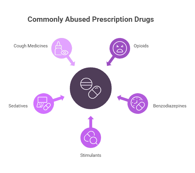 Prescription-strength cough syrups containing codeine or dextromethorphan are also commonly abused. High doses produce euphoric or hallucinogenic effects, with risks of respiratory suppression and long-term health damage.