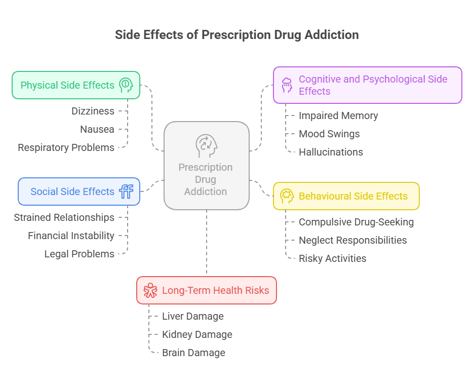 The side effects of prescription drug addiction affect physical health, mental well-being, and social functioning, as indicated below: