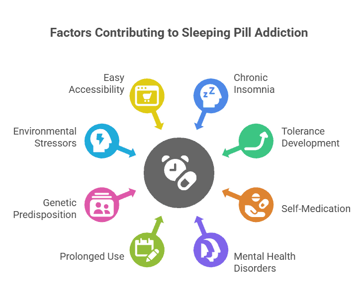 The causes of sleeping pill addiction are biological, psychological, and environmental factors that contribute to dependence, and are outlined below: