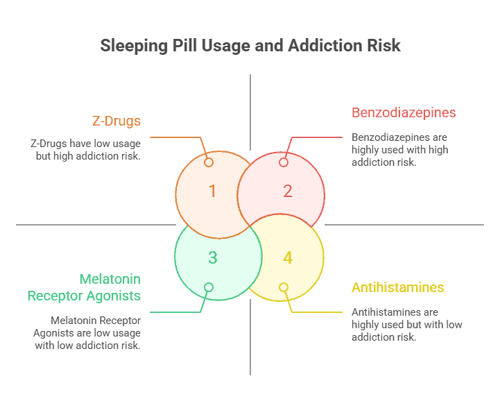 About 8.5% of adults worldwide use sleep medications daily, with higher rates among older adults. Common drugs include benzodiazepines (e.g., diazepam, alprazolam) and non-benzodiazepine Z-drugs (e.g., zolpidem), both carrying risks of dependence and addiction, as noted by Ma et al. 2023 in “Global Trends in the Consumption of Benzodiazepines and Z-Drugs in 67 Countries and Regions From 2008 to 2018: A Sales Data Analysis.”