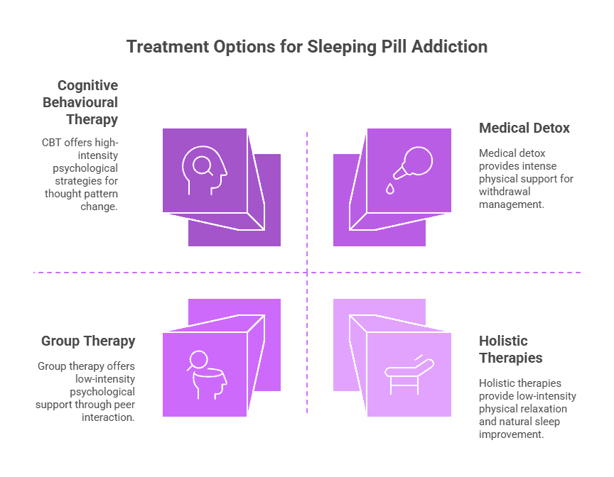 Different treatment options for sleeping pill addiction include de-addiction programs like medical detoxification, behavioural therapies, and holistic recovery approaches that restore healthy sleep patterns.