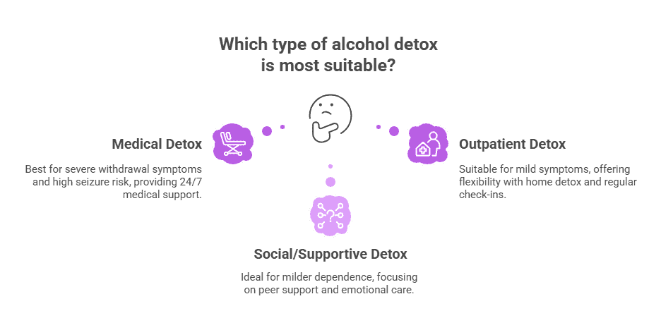The different types of alcohol detox that provide varying levels of care depending on the severity of withdrawal risk and personal needs are medical detox (inpatient), outpatient detox, and social/supportive detox.