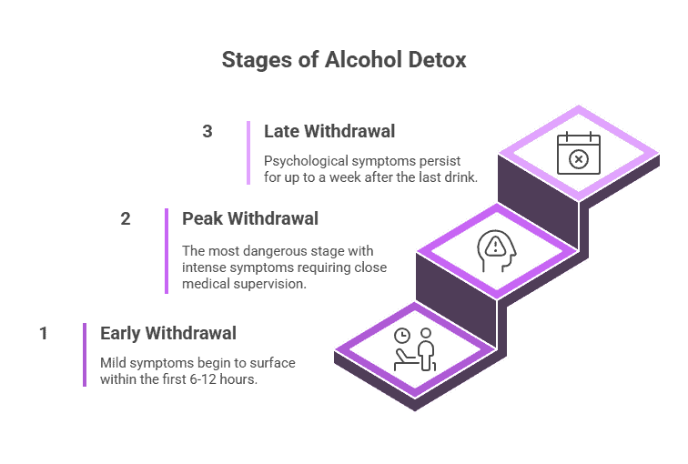 The typical timeline for alcohol detox follows several stages, beginning within hours of the last drink and progressing over several days. The typical timeline for alcohol detox is highlighted below: