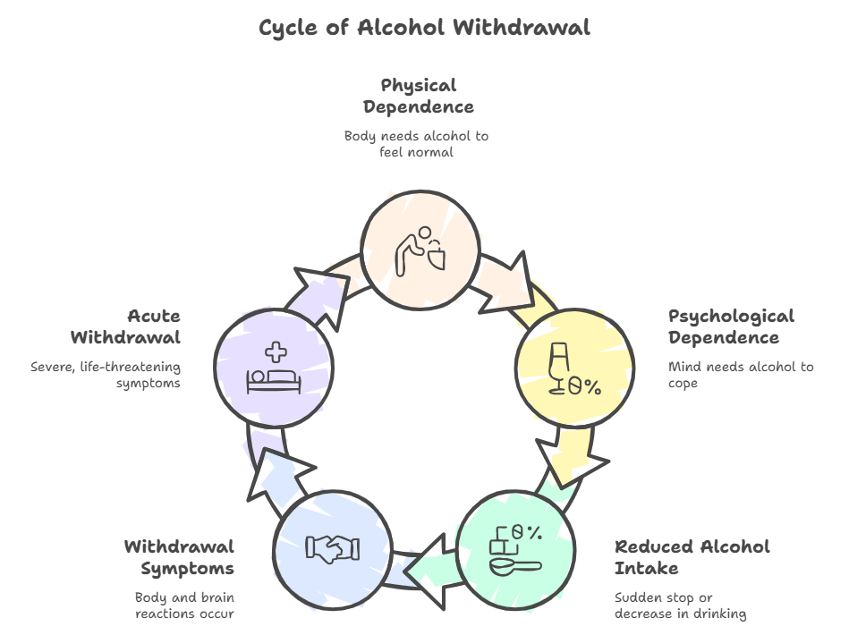 Alcohol withdrawal happens automatically when someone with alcohol dependence stops drinking, causing the central nervous system (CNS) to become overactive.