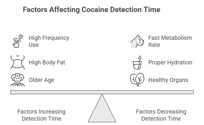 Several factors influence how long cocaine stays in the system: the dosage and purity of the drug, frequency and history of use, metabolic rate of the individual, presence of other substances, and the type of test administered. For example, heavy or chronic users tend to have longer detection times because the body may process and eliminate the drug more slowly.