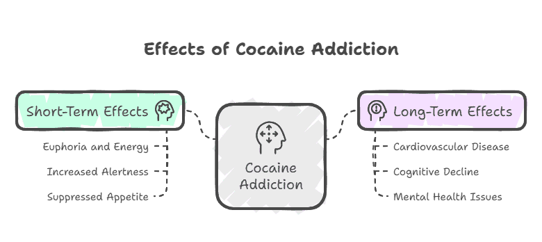 The effects of cocaine addiction are short-term stimulation, long-term physical decline, and serious psychological harm. In the short term, cocaine produces euphoria, alertness, and suppressed appetite, while long-term use damages cardiovascular health, disrupts sleep, and contributes to psychiatric disorders.