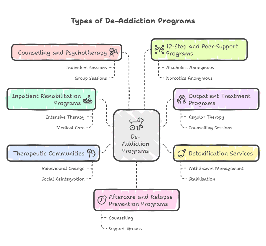 The process of de-addiction involves multiple stages, including detoxification, counselling, behavioural therapies, medication-assisted treatment, and long-term rehabilitation.