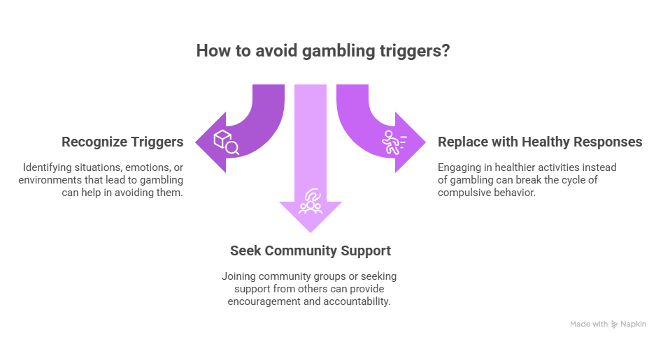Recognise situations, emotions, or environments that compel gambling and deliberately avoid them. This helps break the cycle of compulsive behaviour and reduces temptation by replacing gambling with healthier responses.