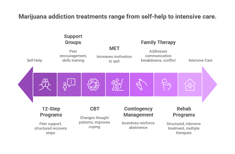The treatments for marijuana addiction are a range of evidence-based de-addiction therapies and support systems aimed at curbing cannabis dependence and improving long-term recovery outcomes. The treatment options for marijuana addiction are elaborated below: