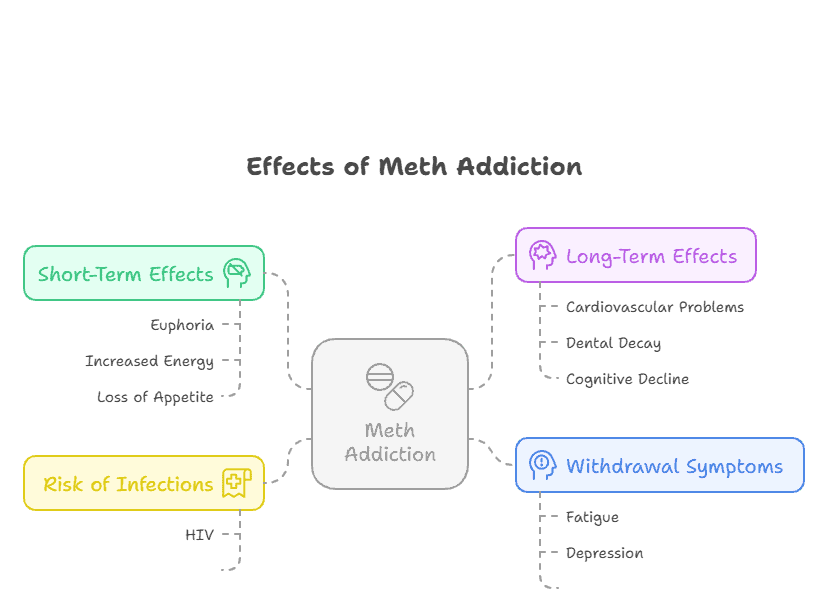 The common effects of meth addiction are short-term euphoria, heightened energy, increased wakefulness, as well as long-term cardiovascular damage, dental decay, and cognitive decline. In the short term, meth enhances mood and confidence, but over time, its neurotoxic effects solidify irreversible harm to both physical health and brain function.