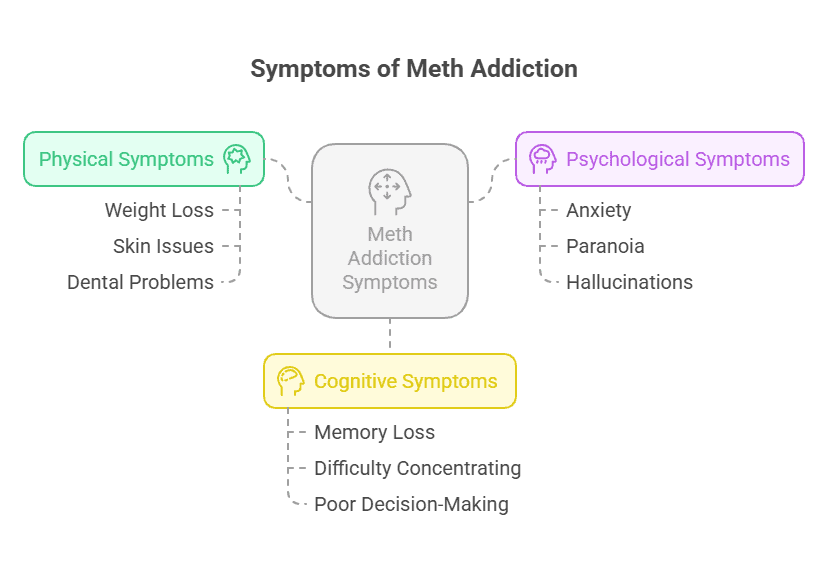 The symptoms of meth addiction are physical changes, psychological disturbances, and cognitive impairments. Physically, users experience rapid weight loss and skin issues; psychologically, paranoia and anxiety are common; and cognitively, meth impairs memory and learning.