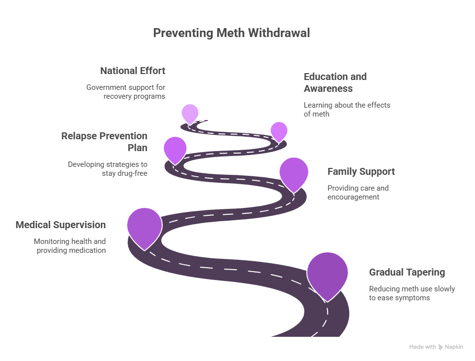 The main prevention strategies for meth withdrawal include relapse prevention, education and awareness and national efforts like Nasha Mukt Bharat Abhiyaan, run by the Ministry of Social Justice and Indian NGOs.