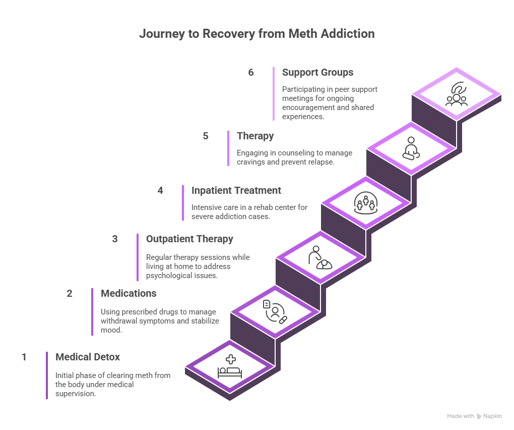 Medical detoxification is a safe process in a de-addiction treatment centre, such as a rehab, clinic or hospital, where doctors help the body clear meth. This is the first step of meth treatment where doctors monitor vital signs, give fluids, and sometimes medicine to ease pain, cravings, or sleep.